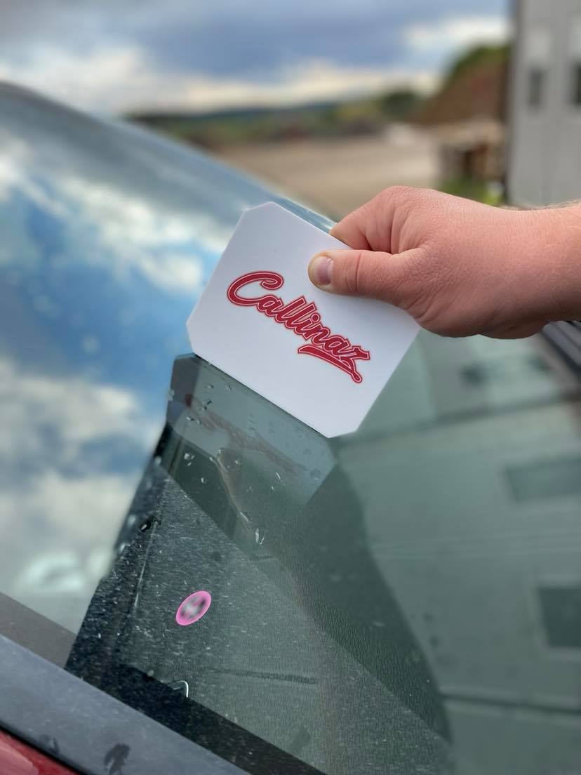 Vit isskrapa med Callinaz-tryck.